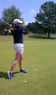 Our golfing day arrived and for July 5th, the weather was relatively mild. Sure, it was warm, but it wasn't in the triple digits like pretty much every other year. Thank God. I donned the only moisture wicking polo I own (I was trying to look as country-clubbish as I possibly could) and we headed to the driving range to practice. I had no idea what to expect. I had resigned myself to the fact that I would likely suck and would have to run all over the fairways trying to collect my wayward balls.